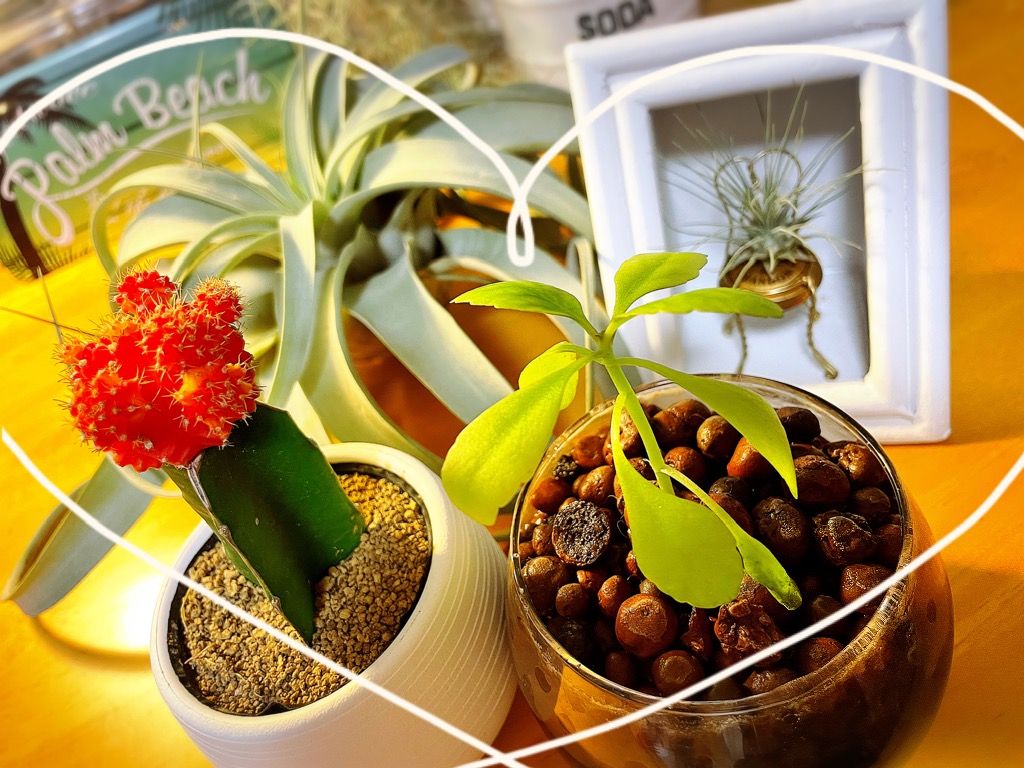 先日新たに仲間に迎えたオレンジのヒボタンちゃん(サボテン)とエアプランツたちと一緒にパシャリ。